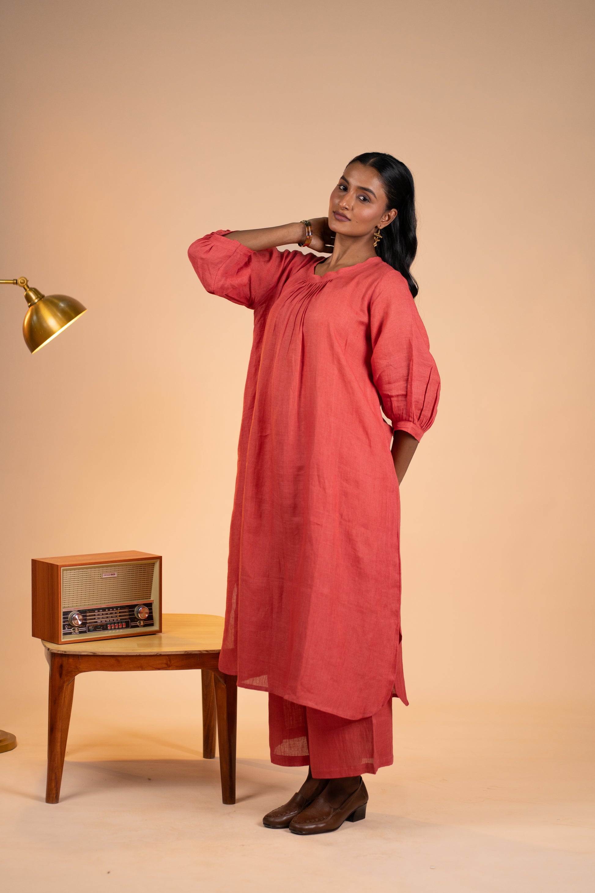 Gajri linen pleated neck kurta set
