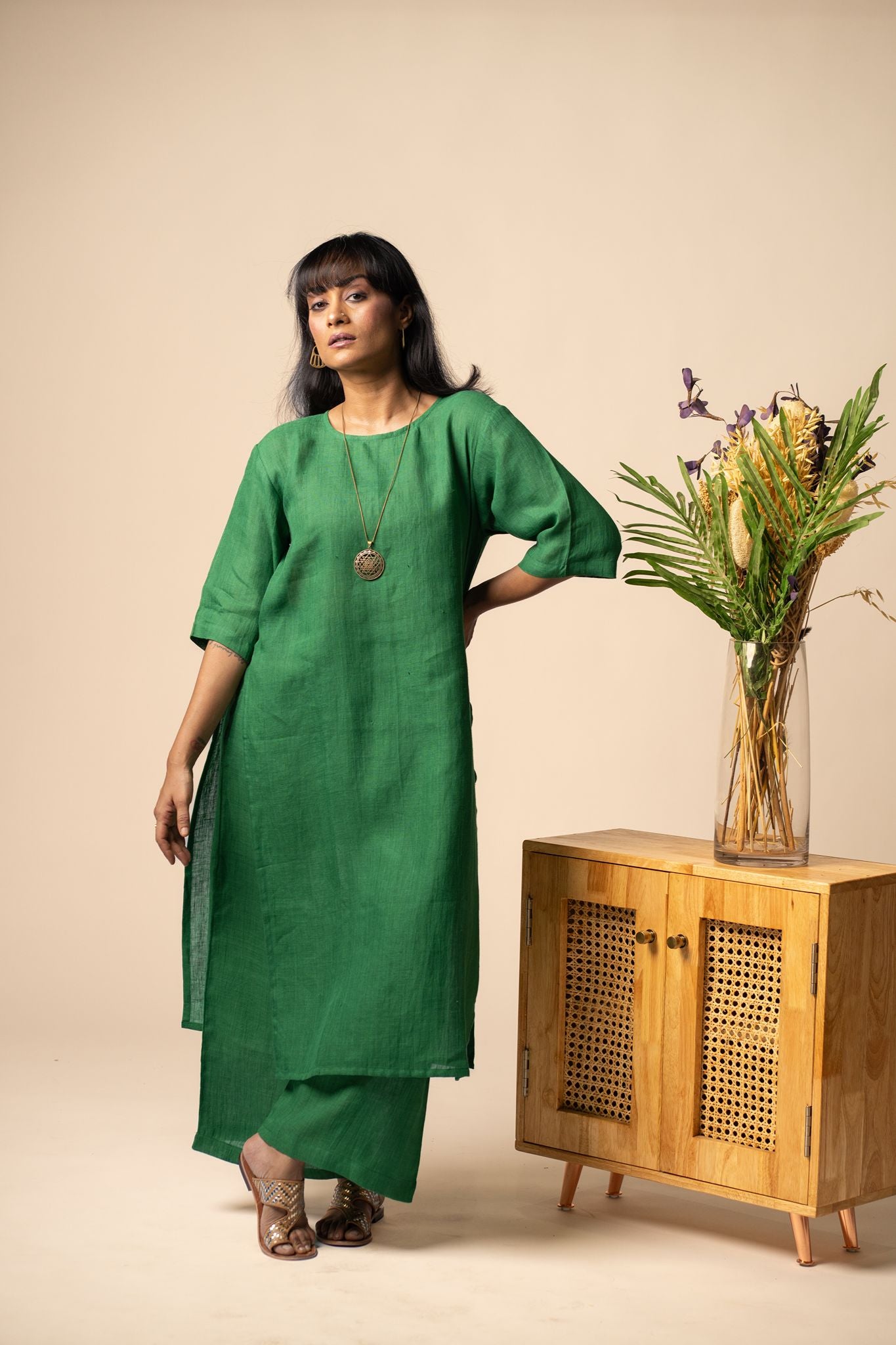 Discover purposeful elegance with our Emerald Forest Green Linen Kurta Set, a mindful wardrobe essential designed for women who value sustainable style and artisan craftsmanship.