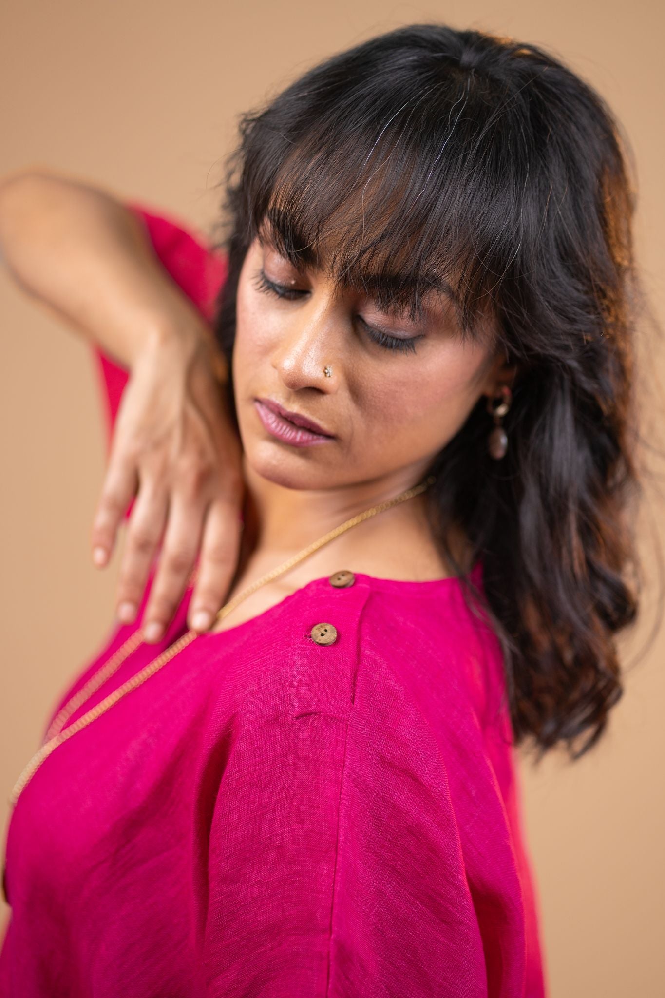 The Fuschia Pink Linen Kaftan, a radiant blend of sustainable craftsmanship and modern comfort designed for women embracing mindful, vibrant style. This de-sign is a celebration of earth-friendly fibres crafted to brighten sunny days and eco-conscious wardrobes alike.